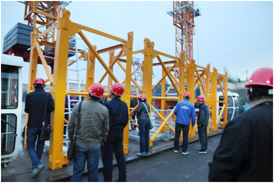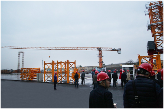 全體與會(huì)嘉賓參觀大漢股份專為裝配式建筑研發(fā)的平頭片式7025、7530塔式起重機(jī)(一)